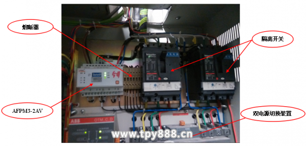 本商場綜合樓項目的AFPM3-2AV三相交流雙電源電壓傳感器安裝于斷路器或隔離開關的輸出端和雙電源切換裝置的輸入端之間,主電源電壓信號接1,2,3,4這四個端子,備用電源電壓信號接5,6,7,8這四個端子,以位于地下室區(qū)域的消火栓泵配電箱雙電壓監(jiān)控為例,傳感器AFPM3-2AV安裝位置示意圖如圖2所示,實物安裝位置圖如圖3所示,電壓信號接線示意圖如圖4所示。